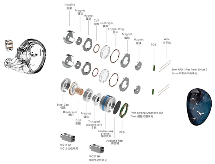 The Phoenixcall is a hybrid, five drivers earphone that uses a 7mm strong magnetic coil for the low frequencies, a customized BA driver for the mid frequencies, another customized BA driver for the mid-high frequencies, and two Micro planar drivers (Flat panel drivers) for the ultra-high frequencies.