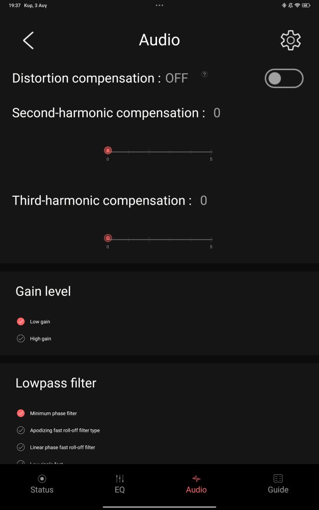 The user can adjust the gain, select low pass filters and access the EQ stored curves, select 60 or 120 volume steps, set the maximum volume, enable charge protection, set screen brightness and timeout, rotate the screen orientation, enable the car mode etc.