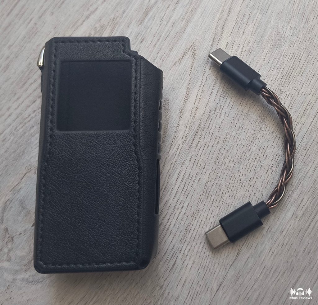 The package includes a leatherette protective case, a specially-made short dual type-C OTG data cable, a screen protective film that is pre-installed and the documentation. The case is well made, the fit is firm and the press points are precisely aligned with the buttons of the device.