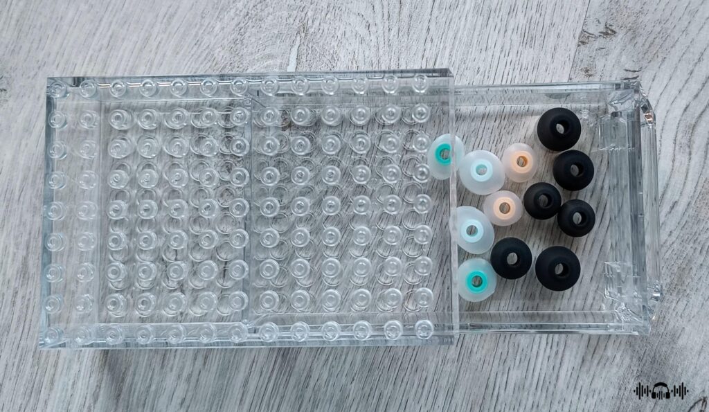 The package consists of three sizes of balanced and bass ear-tips, along with a transparent plastic case that resembles a Lego brick. However, it is more suitable for storing the FiiO JH5 rather than being convenient for portable use.