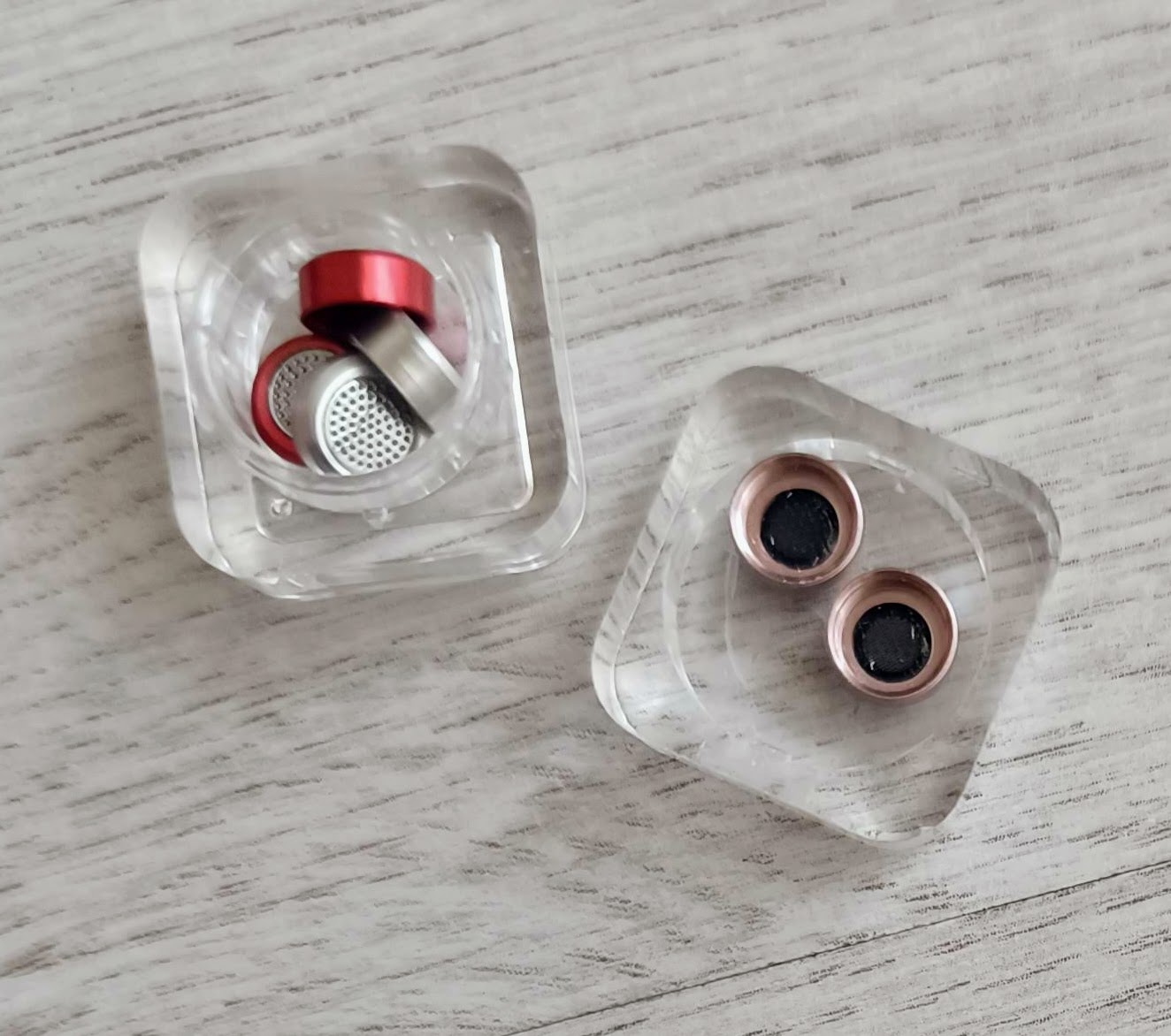 The Hidizs MP145, just like the Hidizs MS3 and MS5, features interchangeable pneumatic sound tuning filters for tailoring audio experience to your liking. There are three filters that when combined with the specially designed ear tips for low/mid/high frequencies allow the user to effortlessly switch between 9 different music styles. The red filter is for enhancing the low frequencies, the silver for emphasizing the highs and the rose gold is the balanced one.