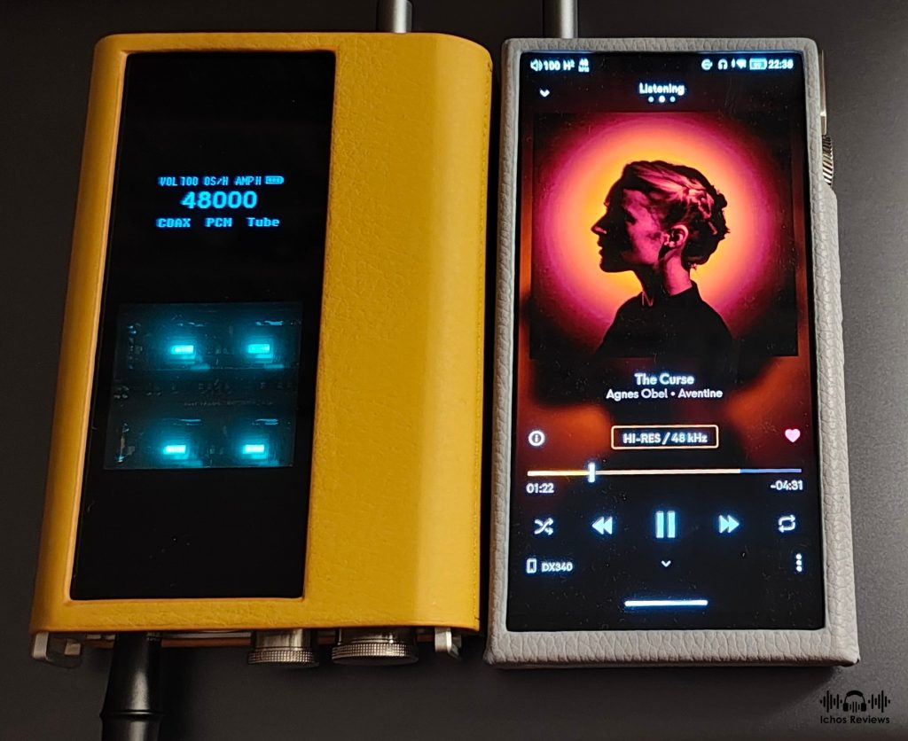 The tube stage is only effective for the phone outputs and can’t be bypassed for a pure solid-state operation of the headphone amplifier, like you can do in the AMP16 of the DX340.