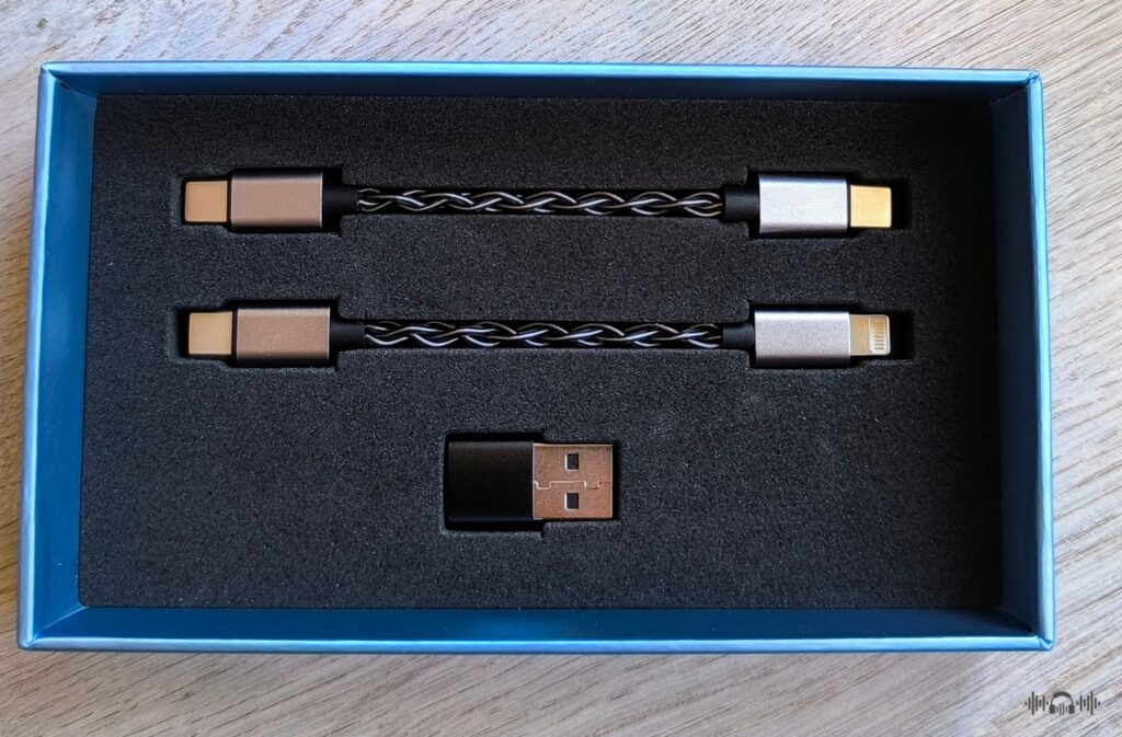 The package contains two premium cables: one USB Type-C to Type-C and another USB Type-C to Lightning, along with a full-size USB adapter. Including a protective case would have been a valuable enhancement.