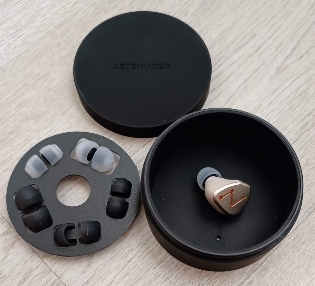 The LETSHUOER DZ4 comes with a hard-plastic cylindrical case that is sturdy but not that pocket friendly, and two types of silicone ear-tips in three sizes each.