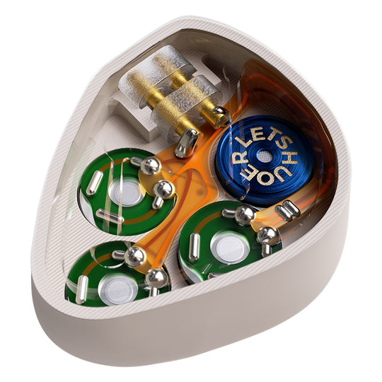 The LETSHUOER DZ4 is an earphone that utilizes a unique configuration of triple 6mm, titanium diaphragm, dynamic drivers and a single 6mm passive radiator. The three dynamic drivers each perform their respective roles, delivering excellent high-frequency performance, rapid transient response, and unleashing three times the sound energy. A four-way acoustic tube and two-way crossover together with carefully selected Knowles acoustic damping material ensure stable sound transmission. The drivers are connected to the dual-pin receptacle via a flexible printed circuit (FPC) crossover board.