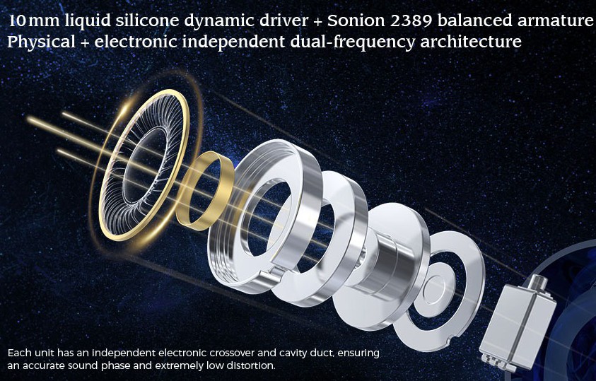 The LETSHUOER Galileo houses a 10mm liquid silicone & Al-Mg alloy dynamic driver unit together with a Danish Sonion 2389 balanced armature driver unit as the core configuration. The pair is designed with an independent electronic frequency crossover and cavity for each driver unit. The tube ensures a precise sound phase and extremely low distortion in the output signal. The brand-new cavity and sound-damping structure developed by LETSHUOER effectively reduces the influence of high-frequency clutter and standing waves. The acoustic cavity structure of Galileo earphones is designed with high-precision 3D printing technology. The complex acoustic cavity is molded with resin materials simultaneously to achieve more accurate physical frequency division.
