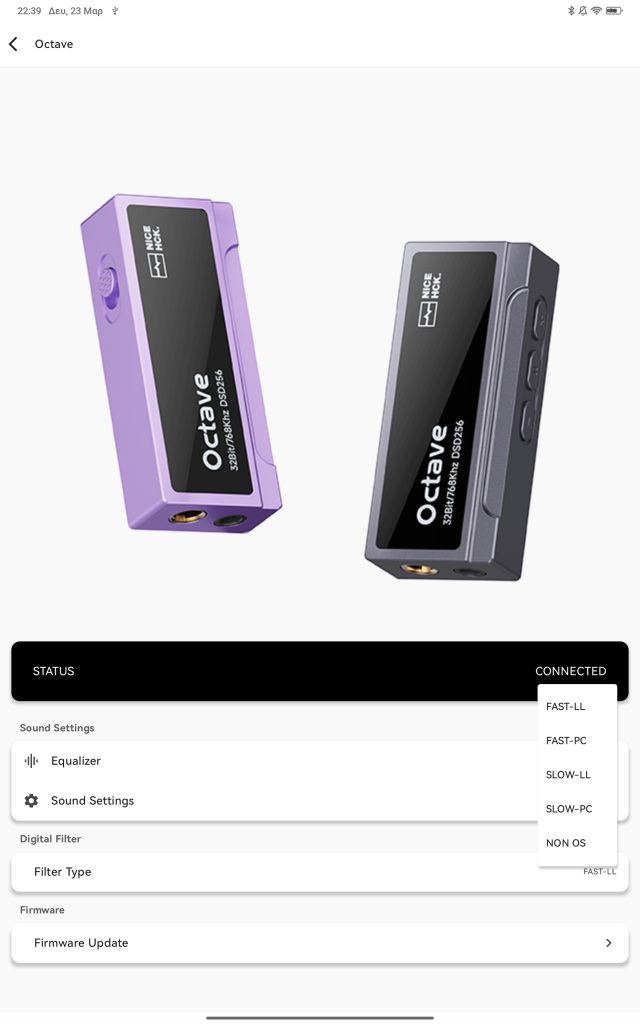 The Octave is compatible with the NICEHCK application which allows the user to customize the 10-band EQ, choose between five different digital filters and perform easy firmware updates. The application is currently available for Android OS.