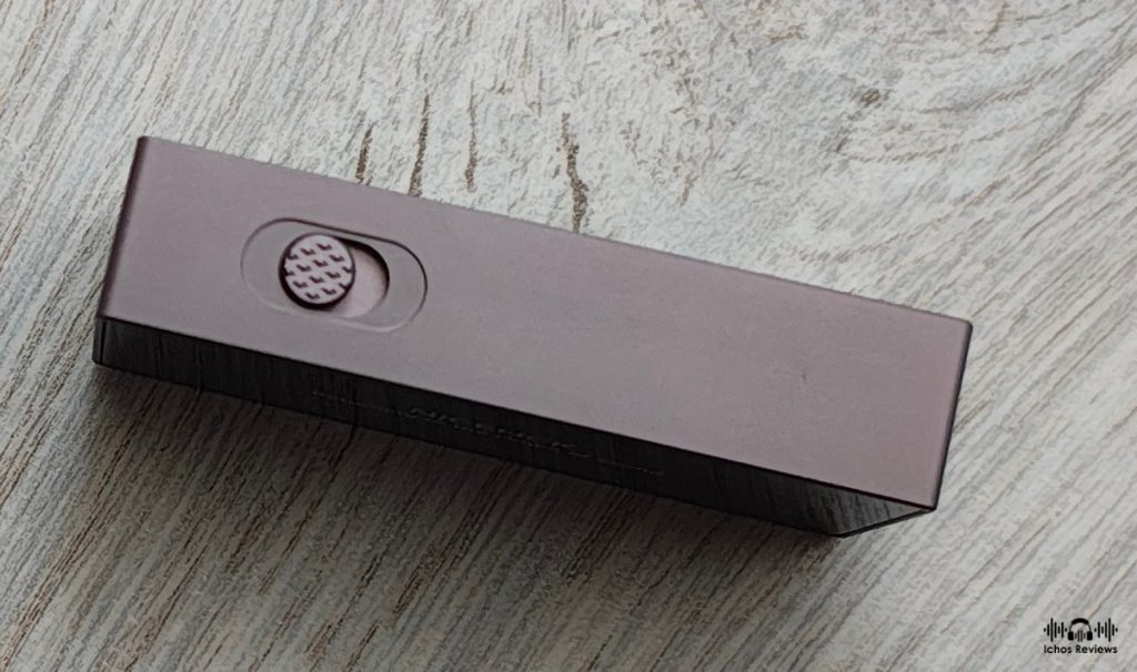 The device is equipped with three side-mounted buttons for raising/lowering the volume and playing/pausing the music plus a switch at the opposite side for toggling the amplifier gain low or high. A small LED light changes colors in accordance with the input sampling rate.