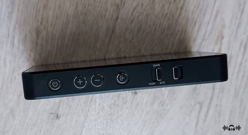 Volume control is achieved through two buttons, allowing for both single-step and continuous adjustments. Additionally, the hold switch can be utilized to lock the device and prevent accidental actions. Please note that the CMA18 Portable does not support further customization through an application and lacks features such as an equalizer or digital filters.