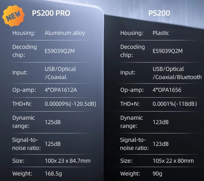 The SMSL PS200 PRO is a compact sized and affordable desktop DAC without a headphone amplifier. It is an upgraded version of the SMSL PS200 but without the Bluetooth connectivity. Please refer to the following image to check the differences.