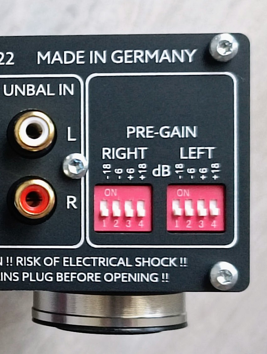 All Violectric amplifiers utilize an innovative pre-gain adjustment system. The user can adjust the pre-gain of the amplifier in seven different values -18 / -12 / -6 / 0 / +6 / +12 / +18 dBr, separately for each channel. This system allows for the lowest possible noise due to a very small internal gain so the inherent noise of the amplifiers is literally inaudible.